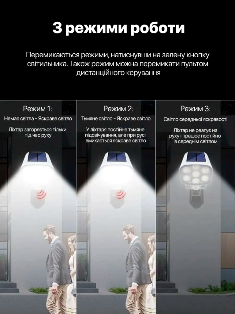 Дуже класна штука!😍Легко збирається, з режимами розібралася, 1mode це на руху світло,світло найяскравіший включається,2 mode це постійне тьмяне ,і 3 mode це постійне світло яскравіше. Мені так подобається!!! Великий плюс це сонячні батареї!! І пультик🫰❤️