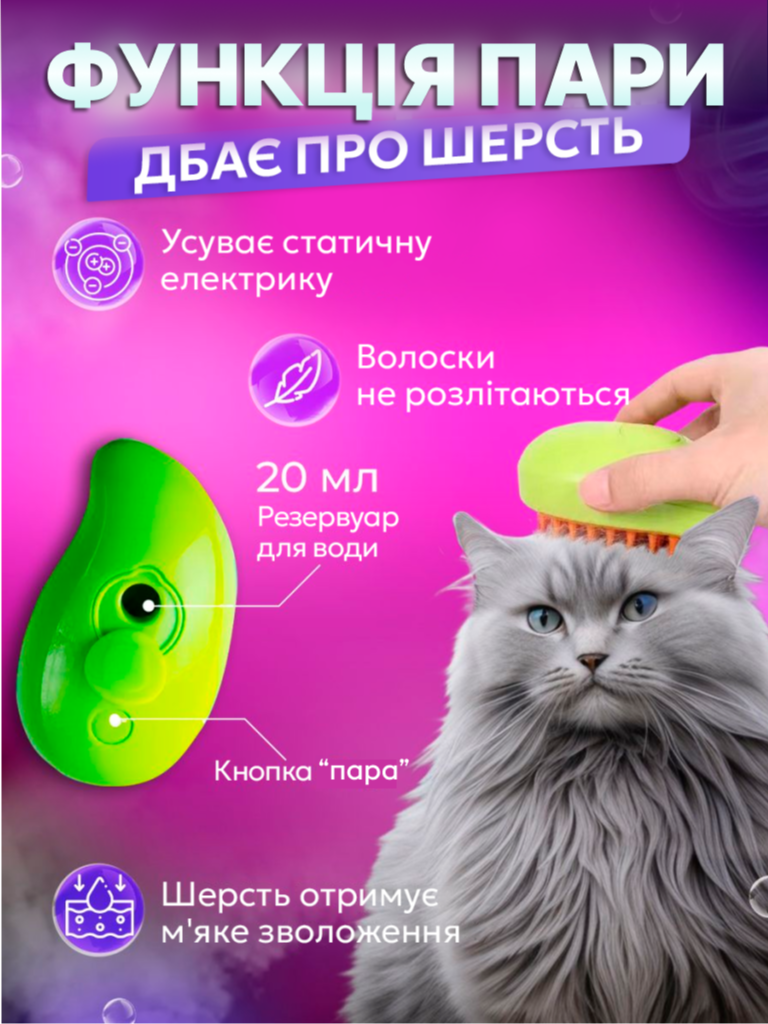 Я придбав цю парову щітку і дуже задоволений результатом! Моя кішка зазвичай не любить, коли її вичісують, але ця щітка змінює все. Пар зволожує шерсть і робить процес набагато м'якшим та приємнішим для тварини. Вичісування стало набагато ефективнішим - більше жодних ковтунів та зайвої шерсті на меблях. Щітка зручна у використанні та легко чиститься. Рекомендую всім власникам пухнастих улюбленців!