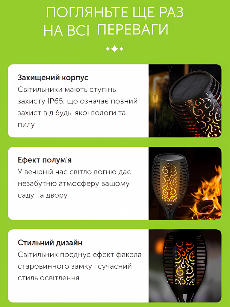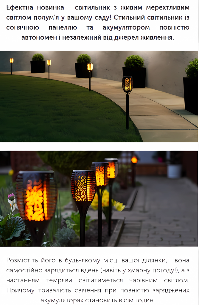 Факели класні, ефект полум'я, що горить, дуже красиво виглядає. Зарядилися за кілька годин, навіть у похмуру погоду. Запаковано чудово, доставка швидка. Рекомендую